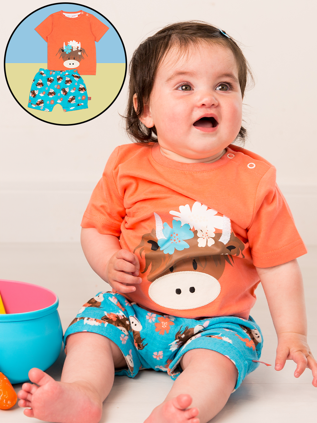 Lightweight Muslin Shorts and Tee outfit set from our Bonnie Highland Cow Collection.