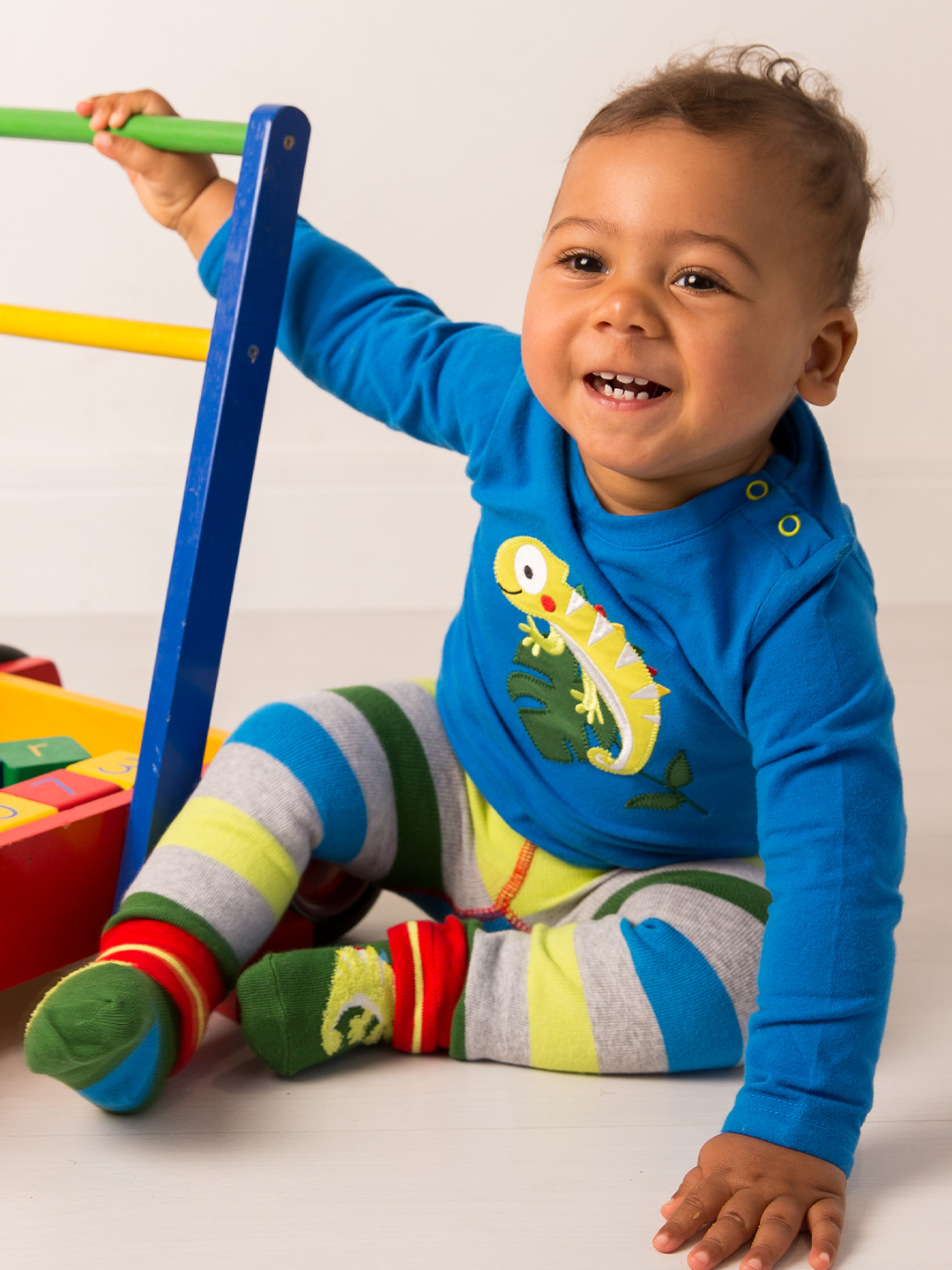 As cool as the Chameleon that features on the bum - these green, blue, grey, and red striped leggings will really brighten up your little ones day!