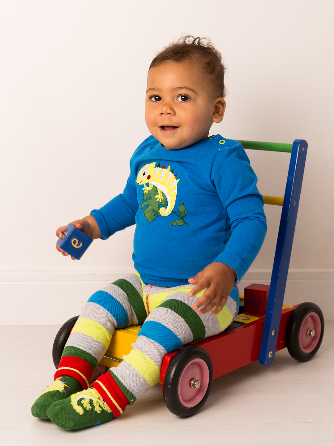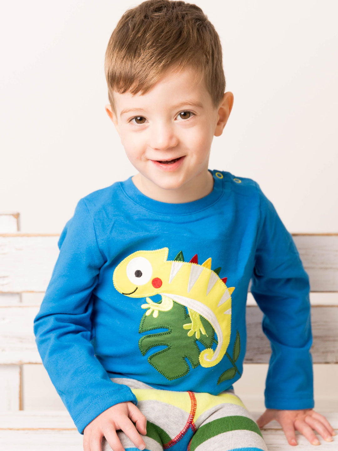 This top will brighten up any day, ocean blue long sleeve top with sweet chameleon character on the front.