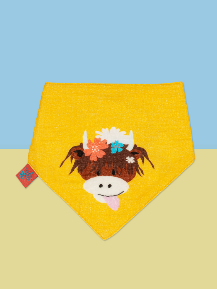 Our adorable Bonnie Highland Cow Muslin bib. They are guaranteed to brighten up your little ones' day!